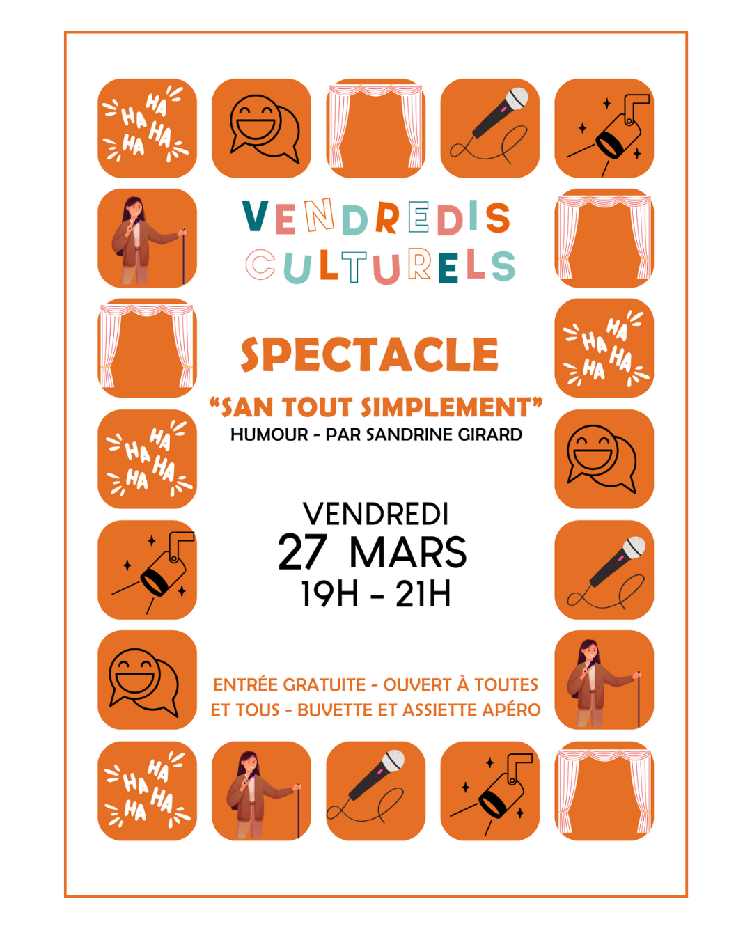 Vendredi culturel - Spectacle d'humour Entrée gratuite - Parking sur place - Buvette et assiettes apéro |